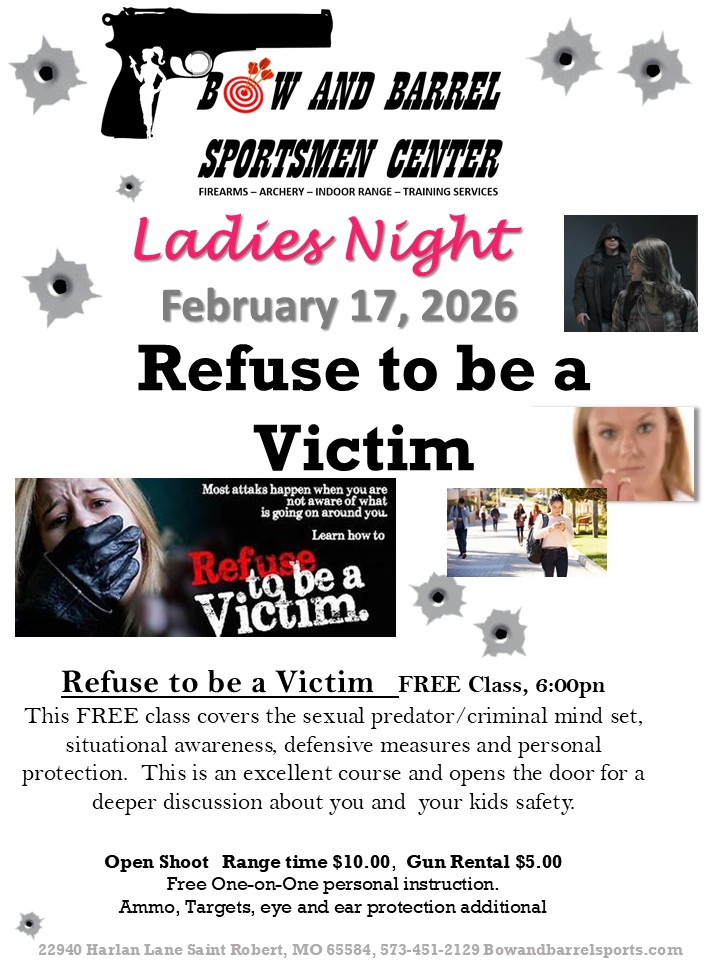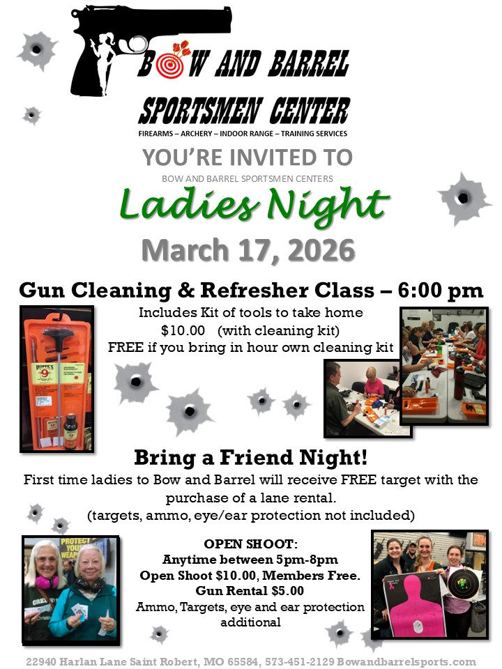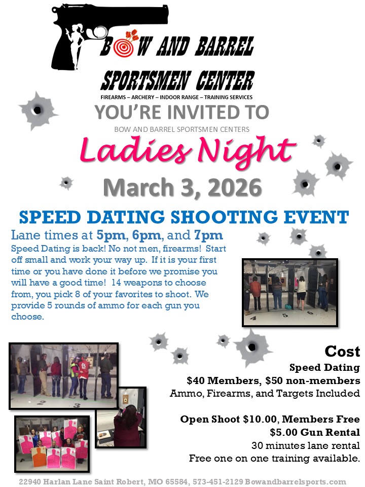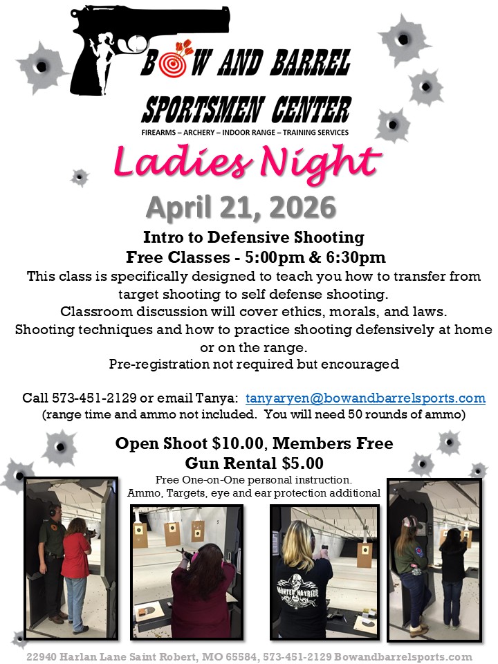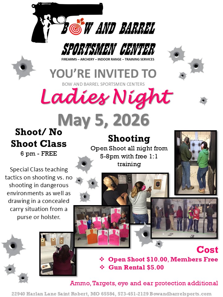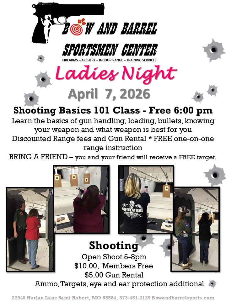 The Bow and Barrel Sportsmen Center is excited about the opportunity to provide a dedicated night to the Ladies. We believe it is important for us to provide a safe and comfortable environment in which we can encourage ladies to participate in the sport of shooting.